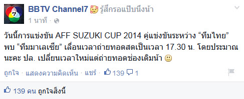 *** ฟุตบอล AFF SUZUKI Cup 2014 ไทย-มาเลเซีย เลื่อนถ่ายทอดสดไปเป็นเวลา 17.30 น. โดยประมาณ ***
