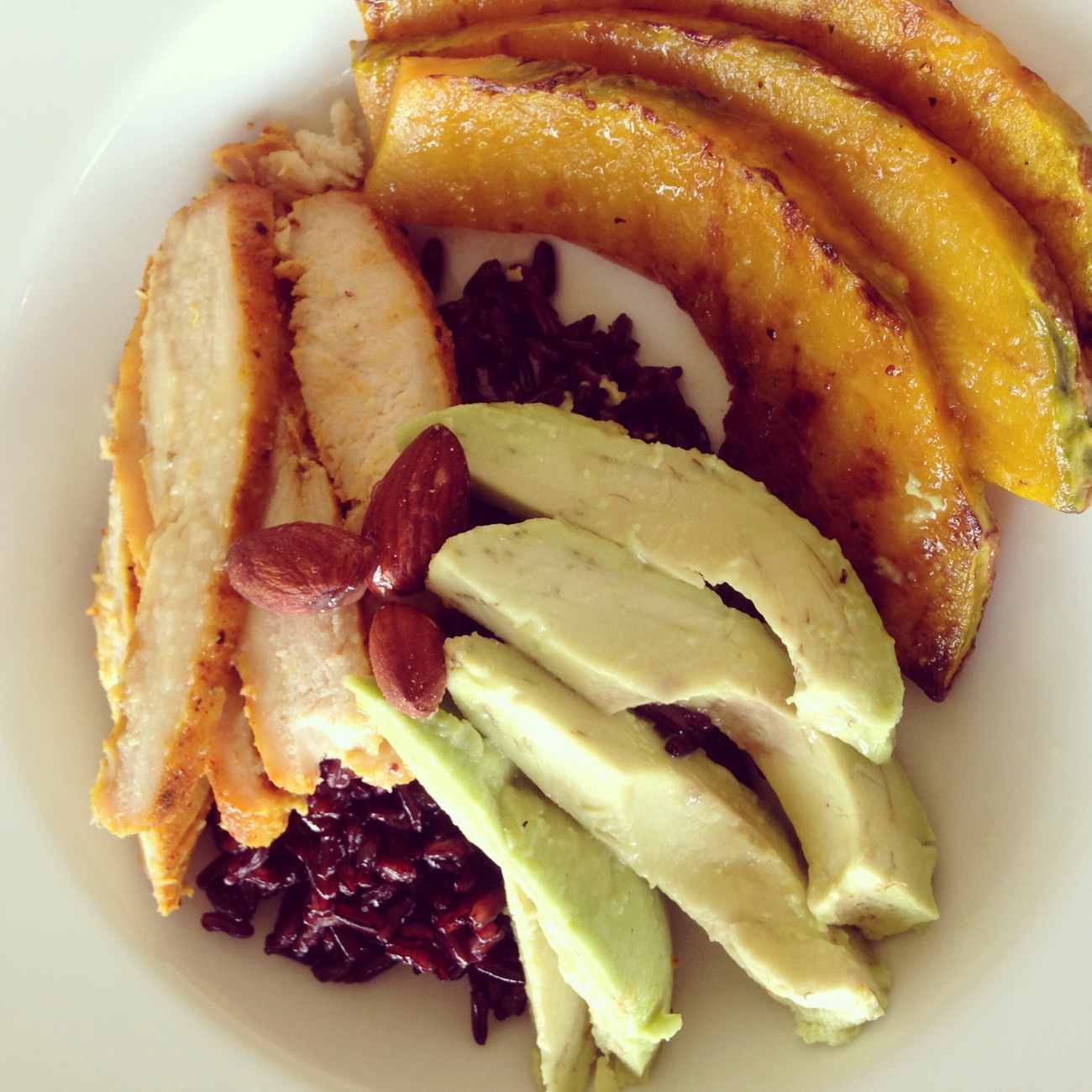 สลัดข้าวกล้องอกไก่ย่างฟักทองย่างและอโวคาโดราดด้วยน้ำสลัดใสๆ