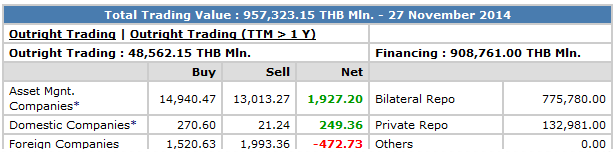เว็บไซต์ตลาดหลักทรัพย์แห่งประเทศไทย รายงานสรุปการซื้อขายหลักทรัพย์ โดยแบ่ง ตามประเภทนักลงทุน ประจำวันที่ 15 มกราคม 2557 ดังนี้ กลุ่ม ปริมาณซื้อ % ปริมาณขาย % สุทธิ (ลบ.) (ลบ.) (ลบ.) นักลงทุนสถาบัน 2,