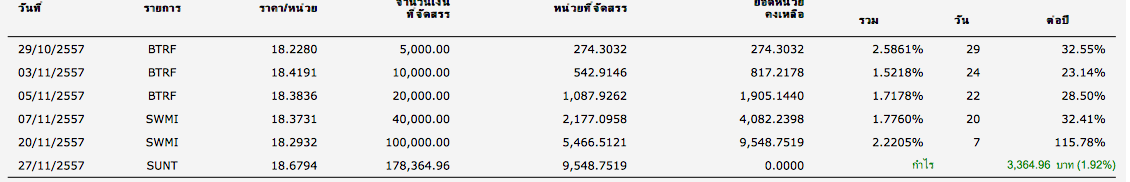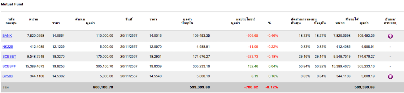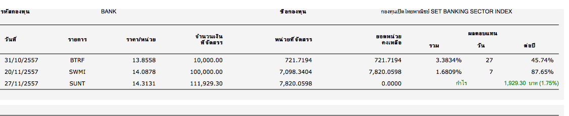 เนื่องจากผมอยากเล่นหุ้น แต่อาชีพตัวแทนประกันไม่สามารถเฝ้าหน้าจอได้ ก้อเลยลองศึกษาจาก ข้อความของคุณ pjuk ที่ตอบในกระทู้ต่างๆ ทำให้สนใจในกองทุนรวม โดยตั่งงบลงทุน 600,000 โดยพักเงินไว้ที่ scbsff วันไหนหุ้นลงเยอะก็เข้าซื้อ โดยเดาจากทิศทางตลาด ก่อน 15.30น และจะลงทุนใน scbsetเป็นส่วนมาก และ SCBbank เวลา Ptt ถ่วงดัชนี ถึงมันจะกำไรไม่เยอะ เวลาหุ้นตก ก็ไม่หวือหวามากเช่นกัน
