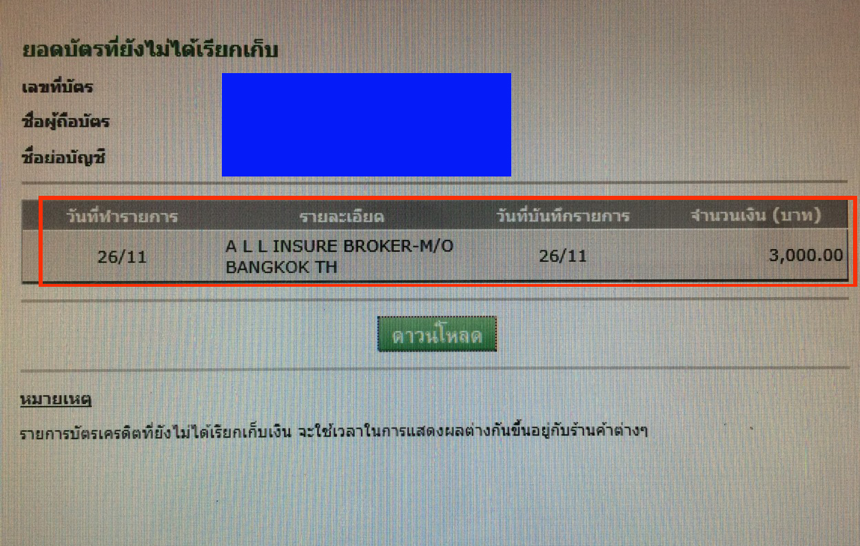 วันที่ 28 พฤศจิกายน เปิดเช็คยอดจะชำระบัตรเครดิต เจอรายการนึงเข้ามา A L L Insure Broker (ไหนบอกว่าจะต้องไปจ่ายที่ธนาคารไงหากต้องการ และไหนบอกว่าต้อง 16 หลักถึงจะใช้ได้ไง ???)