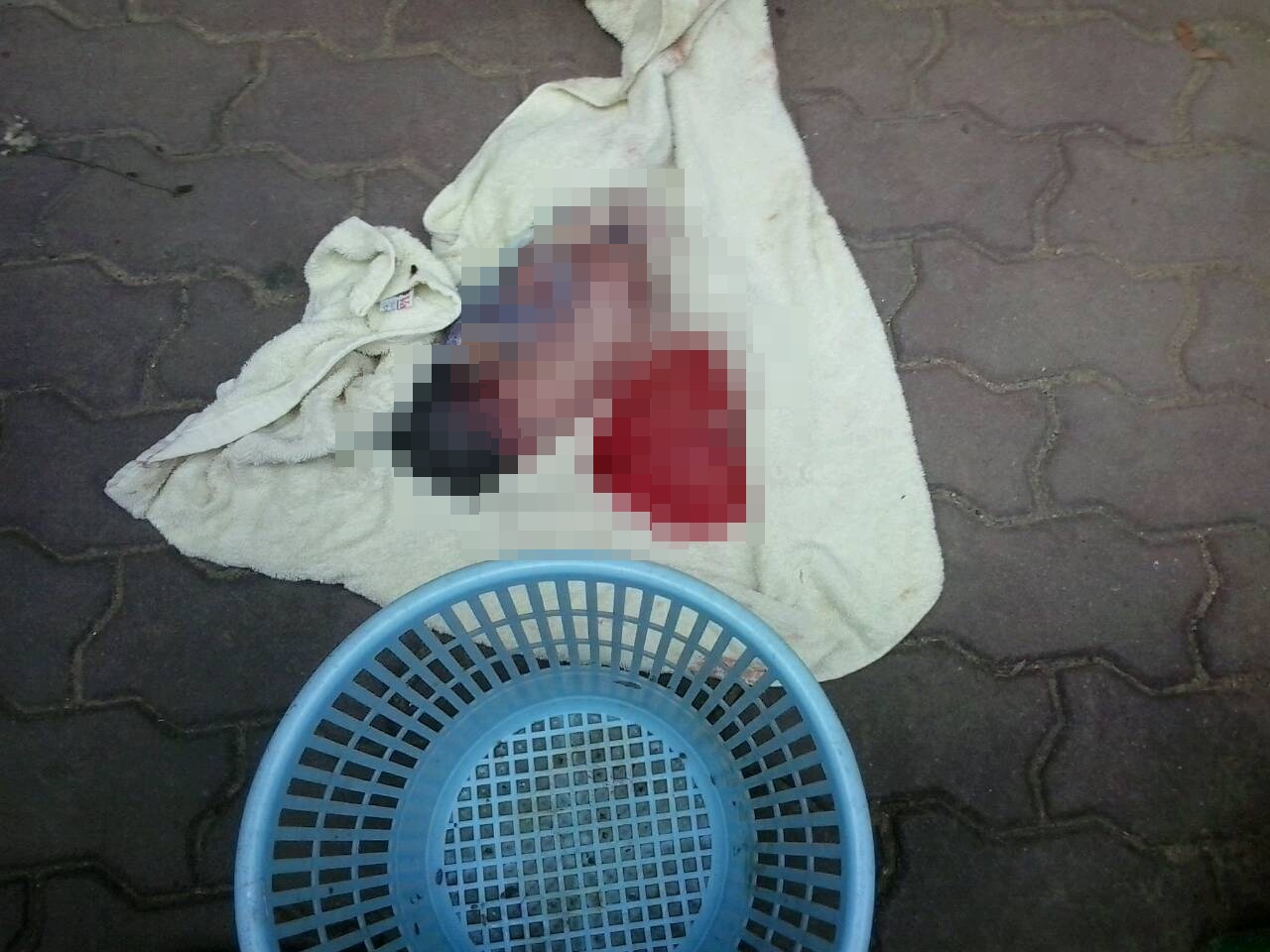 เรายืนอยู่บริเวณนั้นพอดี ก็เดินไปดู พบเด็กที่ตัวเต็มไปด้วยเลือด คล้ายมีสีเขียวคล้ำรอบตัว พร้อมผ้าห่อไว้แล้วมีไหมพรมเล็กๆปิดอยู่
