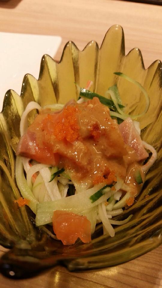 สลัดแซลมอน มีน้ำสลัดให้ตักราดเอง ธรรมดาค่ะ น่าจะเป็นยำแทน ข้างล่างเป็นแตงกวา เราไม่ค่อยชอบแตงกวาเท่าไหร่