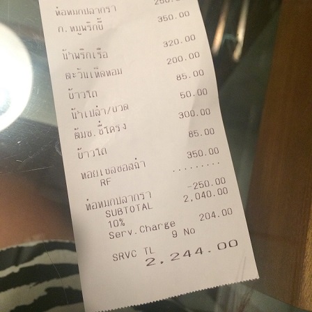 บิลค่าอาหารค่ะ (ไปทานมาจริงๆนะเออ จะเห็นว่าด้านบนมีเมนูห่อหมกปลากราย แล้วถูกหักออกที่ด้านล่างค่ะ)