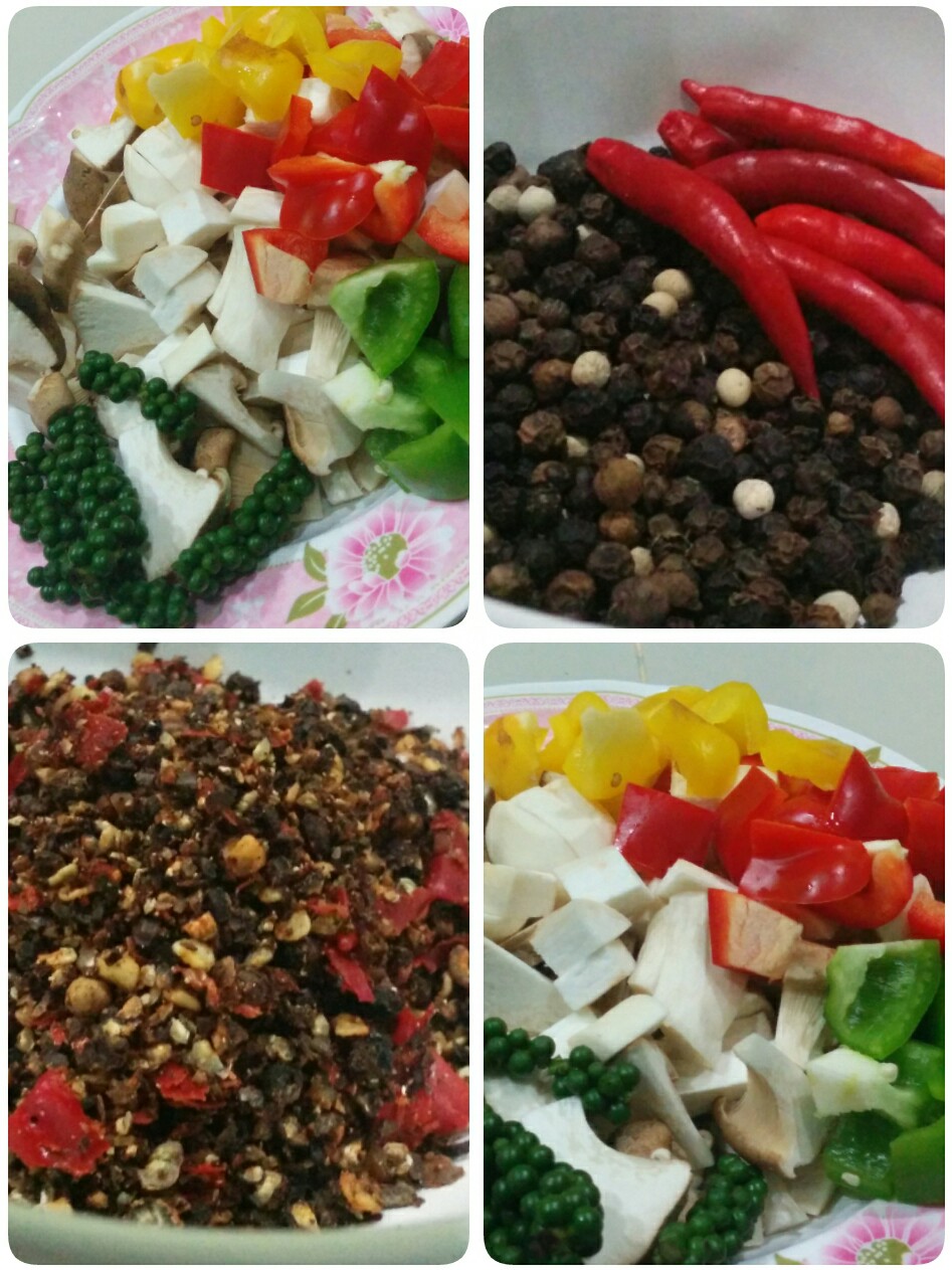 ทีนี้ก็ ตั้งกะทะใส่น้ำมันพอร้อน นำพริกไทยดำโขลกรวมกับพริกขี้หนู พอหยาบ ลงไปผัดให้หอม แล้วตามด้วย เห็ดพริกหวาน ผัดพออ่อนตัวนิดหน่อย ใส่เครื่องปรุงรส เป็นอันเสร็จ
