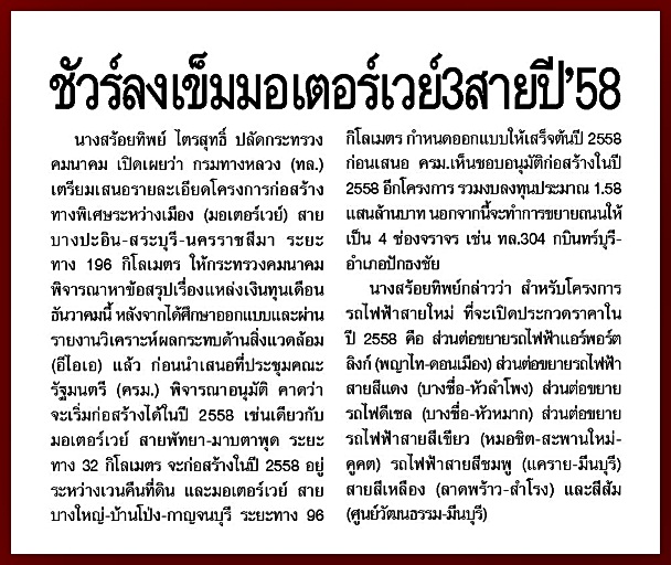 รถไฟไทยใช้สารพัดระบบราง 01/08/57 มติชน (กรอบบ่าย) ยุทธศาสตร์คมนาคมเร่งยิกตอกเข็มทางคู่ปี'58 31/07/57 ประชาชาติธุรกิจ เชื่อมรถไฟวิ่งจีน-มาเลย์ต่อรางเร็วสูงถึงปาดังเบซาร์ 31/