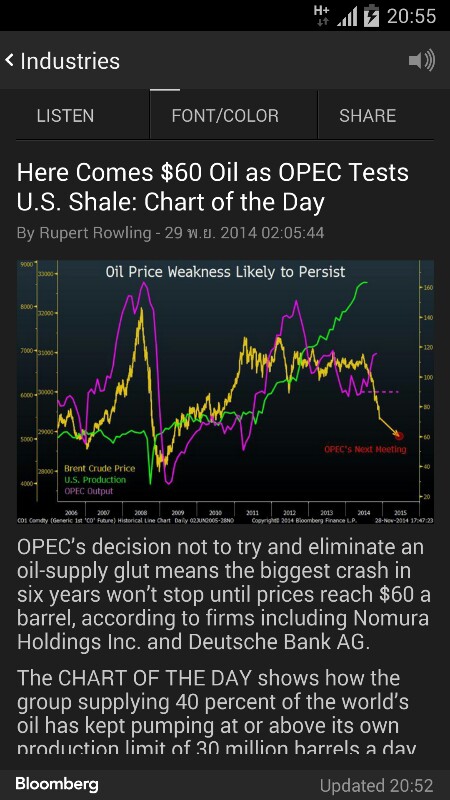 ต้องบอกว่าเหนือความคาดหมายครับ กับการประชุม Opec ที่ไม่ยอมลดเพดานการผลิต ทำอย่างนี้ ต้องการขายถูกๆ แข่งกัน Shale Oil/Gas หรืออย่างไร ก็ว่ากันไปสำหรับผู้ผลิตน้ำมันรายใหญ่/รายย่อย ทั่วโลก แต่สำหรับเม่า