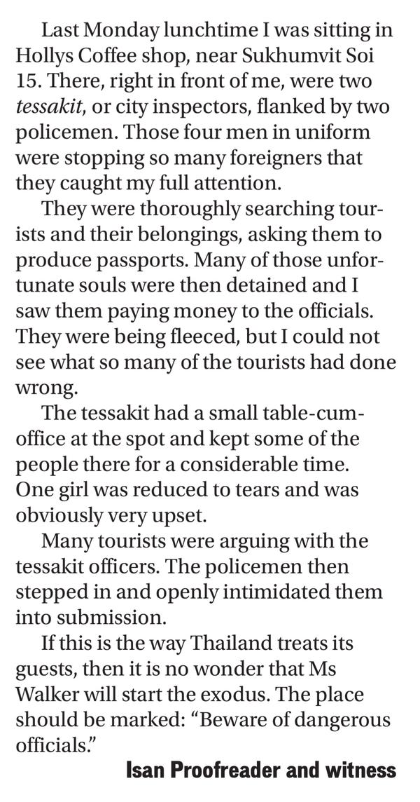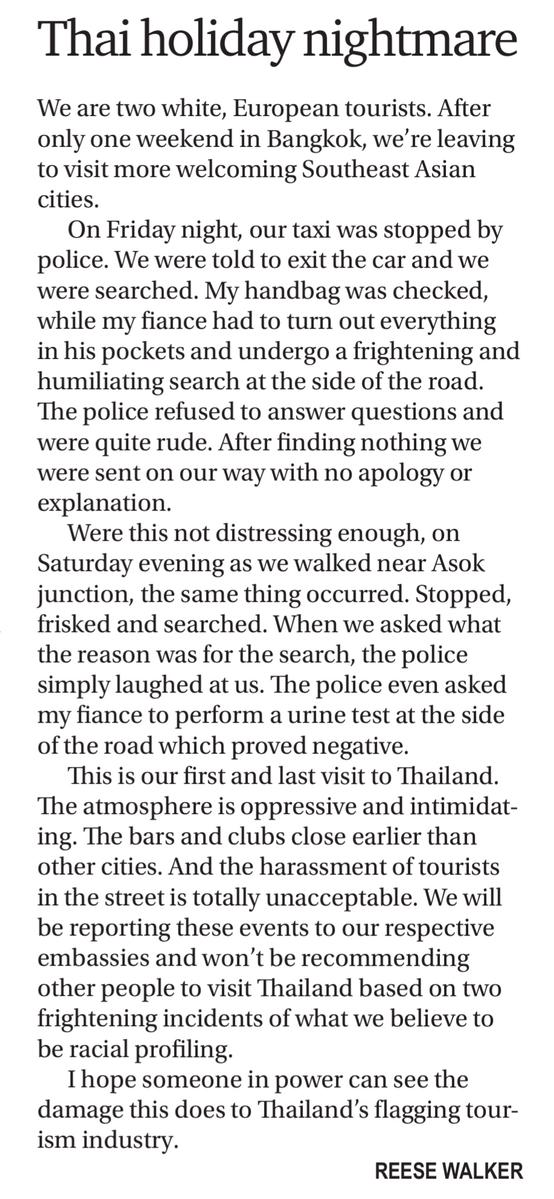 นาย เอียน ลอยด์ นอยเบาเออร์ นักข่าวชาวออสเตรเลียของนิตยสาร 'ไทม์' เขียนบทความบอกเล่าเกี่ยวกับปัญหานักท่องเที่ยวในประเทศไทย ถูกเจ้าหน้าที่ตำรวจคุกคามและรีดไถมากขึ้นในช่วงหลายเดือนที่ผ่านมา จนนายนอยเบาเ
