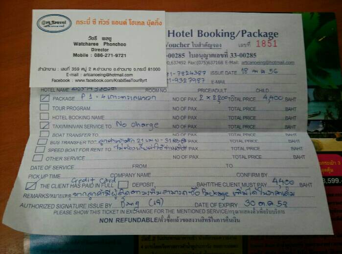 ซื้อทัวร์กระบี่ ซี ทัวร์ แอนด์ โฮเทล บุ๊คกิ้ง ในงานไทยเที่ยวไทย เมื่อวันที่ 18 พ.ค. 2556 หมดอายุ 30 ต.ค. 2558 ซื้อมา 4,400 สำหรับ 2 คน