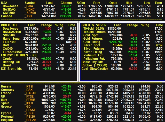ดัชนีเฉลี่ยอุตสาหกรรมดาวโจนส์ปิดที่ 17,912.62 จุด เพิ่มขึ้น 33.07 จุด หรือ +0.18% ดัชนี S&P500 ปิดที่ 2,074.33 จุด เพิ่มขึ้น 7.78 จุด หรือ +0.38% ดัชนี NASDAQ ปิดที่ 4,774.47 จุด เพิ่มขึ้น 18.66 จุด หรือ +0.39%
