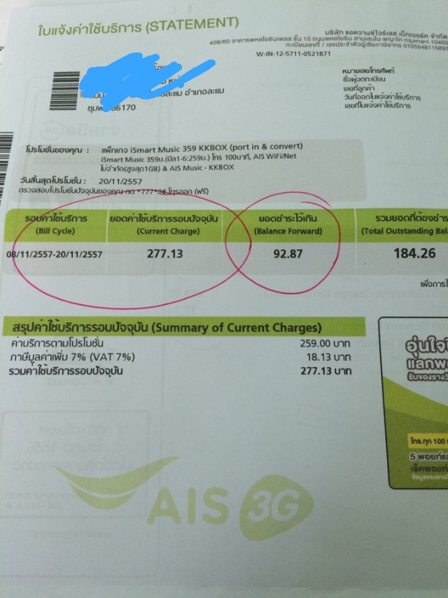 ผมได้ทำการย้ายค่ายจากAISมาDtac เมื่อวันที่21/11/2557 แต่บิลค่าใช้บริการที่ได้รับแสดงค่าใช้บริการทั้งเดือน อยากทราบว่าการคำนวณผิดพลาดเปล่าครับ จากรูปที่แนบมา มีการใช้งานในระบบAIS. ตั้งแต่8/11-20/11/2557 คำนวณได้12วัน ค่าบริการน่าจะประมาณ110 บาท. ไม่ทราบว่าทำไมบิลถึงคำนวณค่าบริการมาเต็ม1เดือนเลยคือ277.13บาททั้งๆที่ใช้แค่12วัน