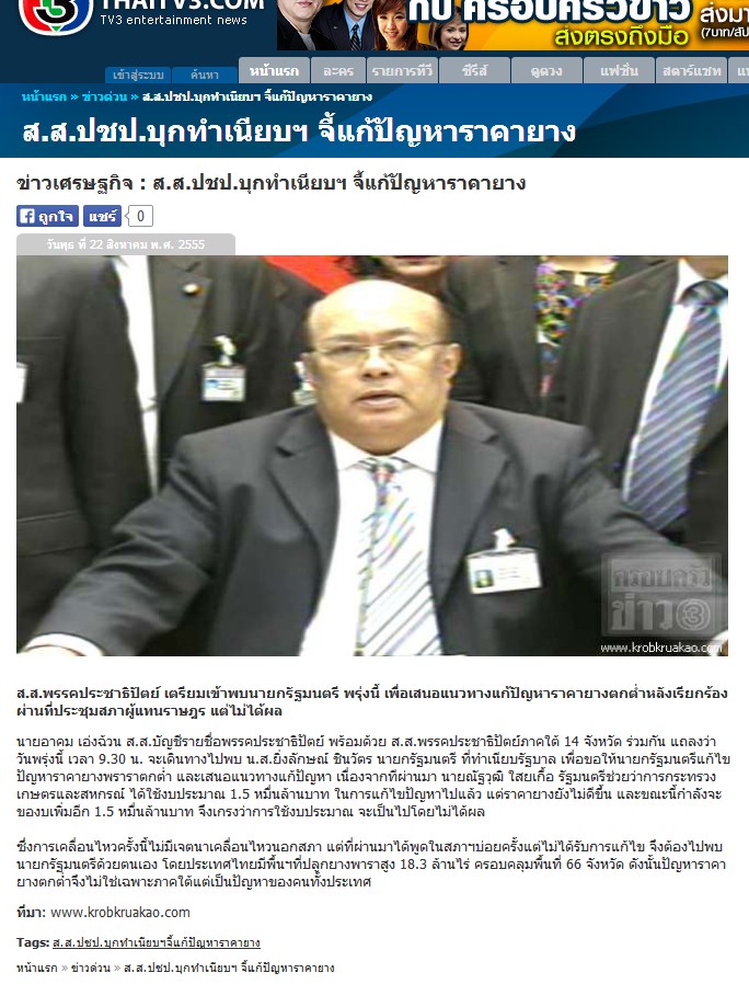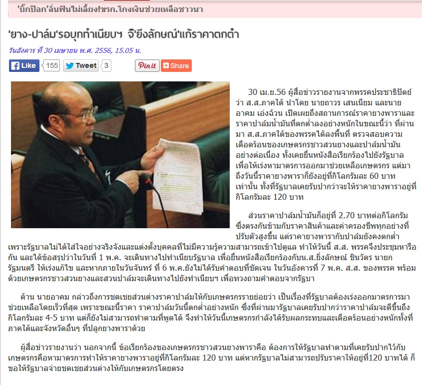 อันนี้ เมื่อ 7 พฤษภาคม 2556 วันนั้น พี่น้องชาวสวนยาง ต่างดีใจที่มี สส. ที่เป็นห่วงเป็นใยแทนพวกของตน โดยที่ สส. เหล่านี้บุกทำเนียบ เพื่อเรียกร้องให้รัฐบาลแก้ไขปัญหาราคายางตกต่ำ ถึงขนาดข่มขู่ว