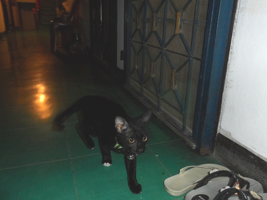 ผ่านมาหลายวัน จนเมื่อเย็นวันพุธ จะออกไปตลาด เดินลงบันได ได้ยินเสียงแมวร้อง มองหาก็เห็นซ่อนตัวอยู่บนฝ้าเพดานใต้บันได แมวตัวนั้นมองมาที่เรา