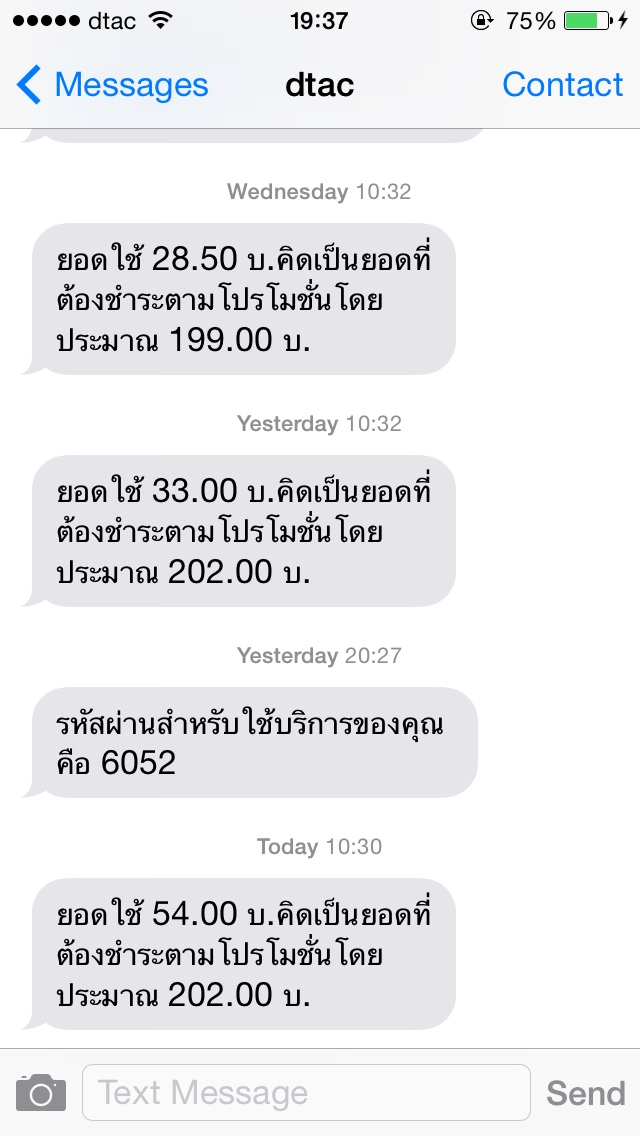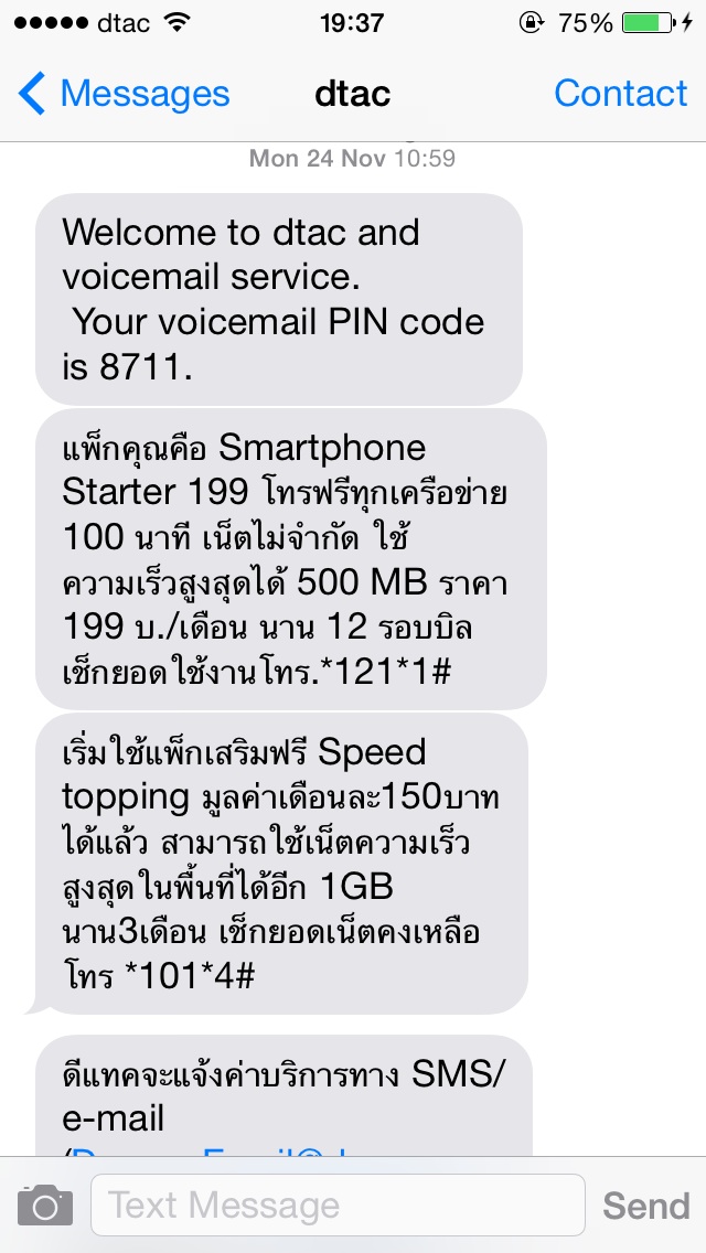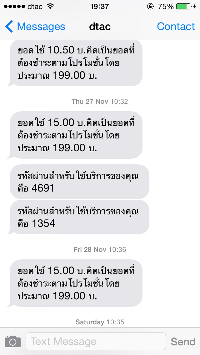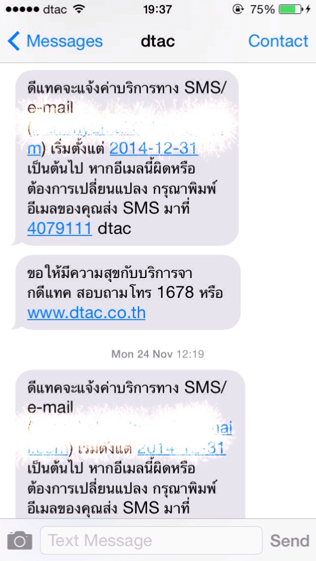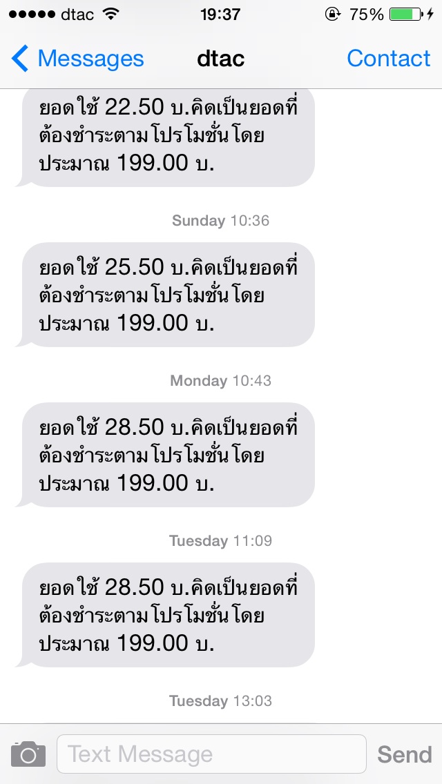 คือเมื่อวันที่ 24/11/57 ทางคอลเซ็นเตอร์ 1678 ของดีแท็คโทรมาหาเราค่ะ ไอ้เราก็หลับอยู่กดปิดเสียงไปสองสามครั้งจนสุดท้ายต้องรับ (ขำตัวเองมาก) แล้วเขาบอกว่ายอดการใช้งานของเรานี่น้อยแบบว่าไม่ค่อยโทรหรือสมัครเน้ตเลย เขาเลยแนะนำให้เรา สมัครรายเดือน เดือนละ 199 ฟรีเน้ตอีก แล้วก็ ค่าโทรฟรีเดือนละ 100 นาที เราก้โอเคตกลง ทาง 1678 ก็ส่งข้อความเข้ามา ว่า
