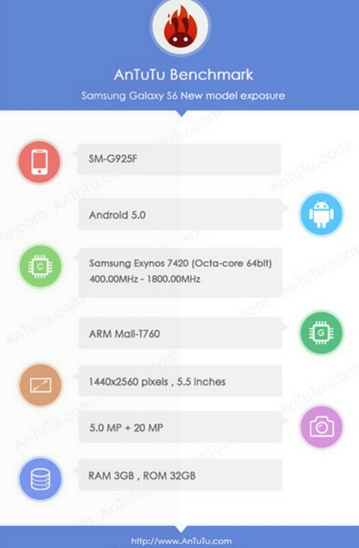 ได้มีการเปิดเผยสเปค Samsung Galaxy S6 ตัวใหม่เรือธงในตระกูล Galaxy S ที่จะวางขายในช่วงไตรมาสแรกของปีหน้า จาก Bencmark ทดสอบสเปคชื่อดัง Antutu มีดังนี้ครับ