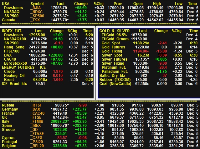 ดัชนีเฉลี่ยอุตสาหกรรมดาวโจนส์ปิดที่ 17,958.79 จุด เพิ่มขึ้น 58.69 จุด หรือ +0.33% ดัชนี S&P500 ปิดที่ 2,075.37 จุด เพิ่มขึ้น 3.45 จุด หรือ +0.17% และดัชนี NASDAQ ปิดที่ 4,780.76 จุด เพิ่มขึ้น 11.32 จุด หรือ +0.24%