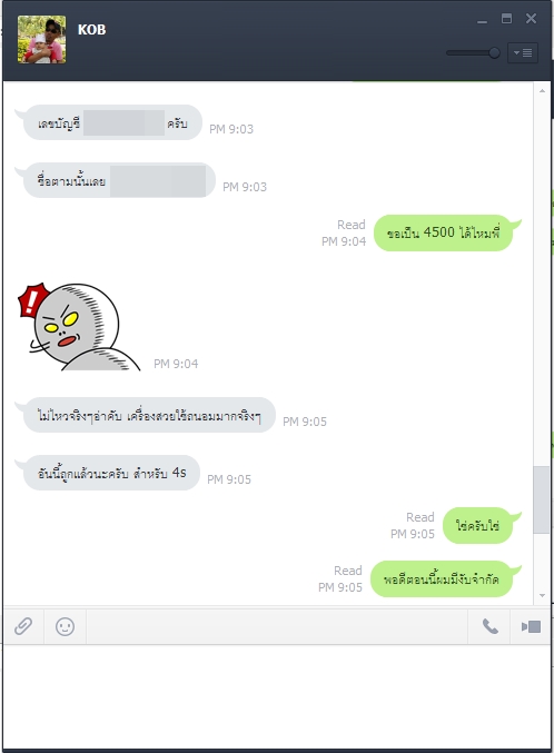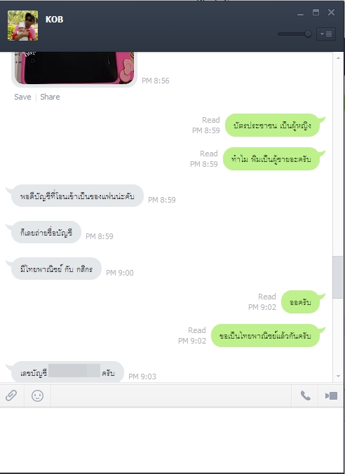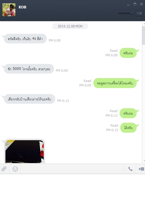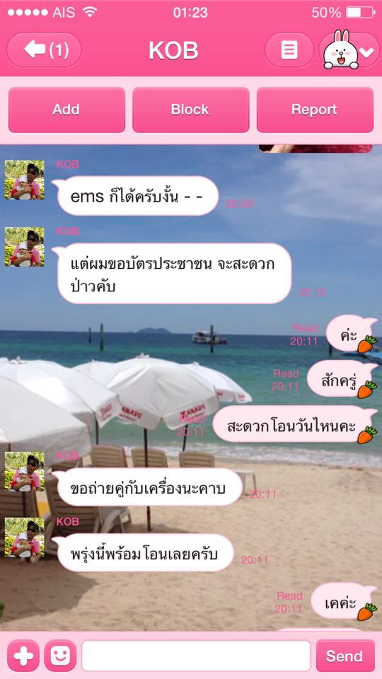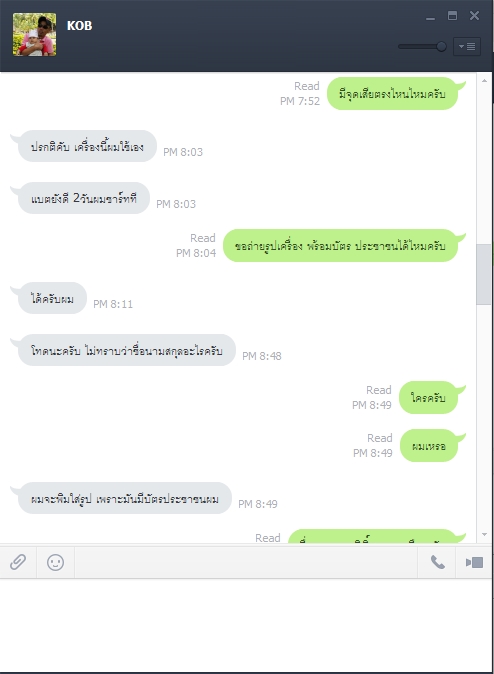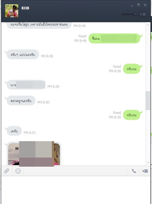 ผมเลยแคปรูปที่ผมคุยไว้กับคนขายซึ่งเค้าบอกว่า คนนี้(KOB) มาติดต่อไว้ โดยขอพวกหลักฐาน และ ให้แนบบัตร ปชช. พร้อมโทรศัพท์ซึ่ง คนขาย (ไอKOB) เนี่ยได้บอกชื่อของผมไป และ ส่งต่อไปยังเจ้าของร้านคสอ. เจ้าของร้านคสอ.ก็ถ่ายรูปแล้วส่งมายัง KOB แล้วก็ส่งมาหาผมอีกที