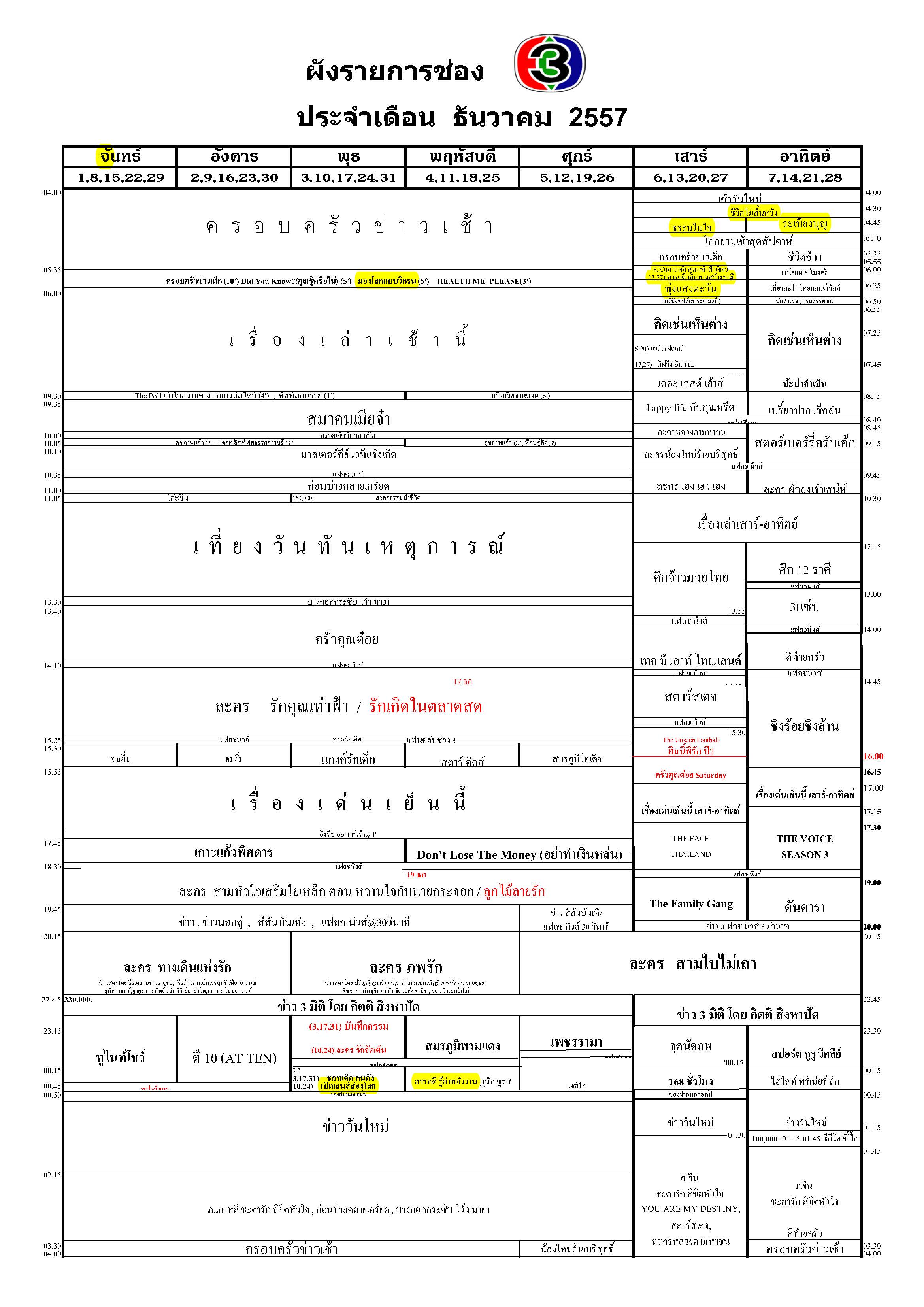 รวมผังรายการต่างๆ ของสถานีวิทยุโทรทัศน์ไทยทีวีสีช่อง 3 (ไทยทีวีสีช่อง 3),สถานีวิทยุโทรทัศน์กองทัพบกช่อง 5 (ททบ.5),สถานีโทรทัศน์สีกองทัพบกช่อง 7 (ช่อง 7 สี),สถานีโทรทัศน์ไทยทีวีสีช่อง 9 อ.ส.ม.ท. (ช่อง