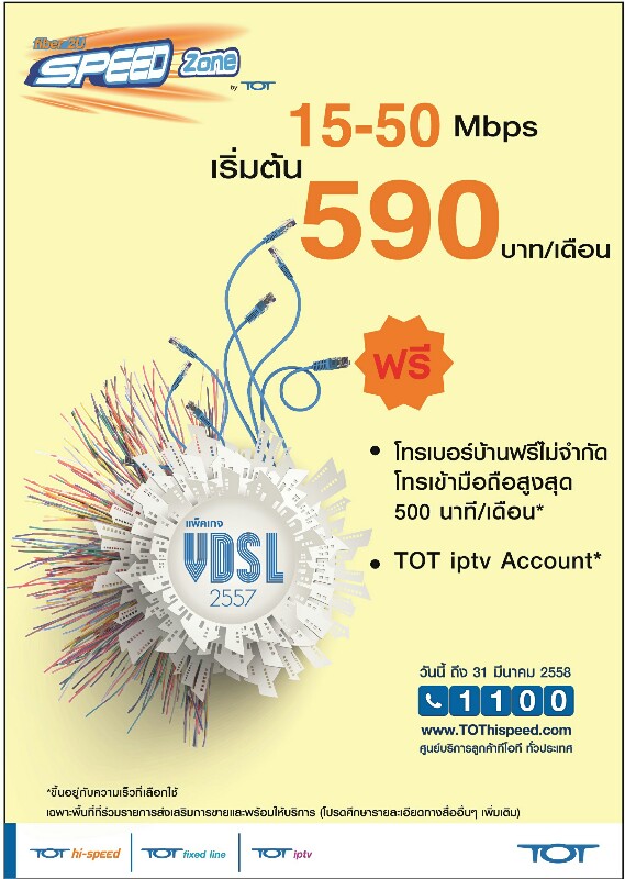 TOT อินเตอร์เน็ตบ้าน แบบใช้สาย VDSL ออกโปรใหม่ 15 เม็ก เพียง 599 บาท แถมโทรฟรีเบอร์บ้านภายในพื้นที่ด้วย แต่ถ้าเพิ่มจำนวนความเร็วก็จะได้เพิ่มเป็นโทรทางไกล ,โทรเข้าเบอร์มือถือ และTOTiptv ฟรีด้วย (ขึ้นอยู่กับการสมัครความเร็วอินเตอร์เน็ต) ก่อนสมัครลองตรวจสอบว่าพื้นที่ของคุณใช้งานได้ดีหรือไม่ เพราะถ้าอยู่ไกลจากเสาส่งอาจจะได้ความ้เร็วลดลงจากโปรที่สมัครครับ hitdee.com