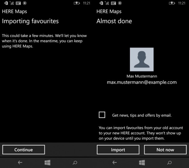 - และหากเราล็อกอินด้วย Nokia Account ระบบจะแสดงหน้าจอให้เราโอนข้อมูลจาก Nokia Account มายัง Here Account ใหม่ได้เลย