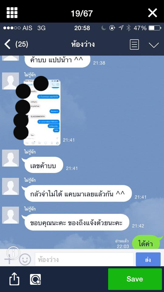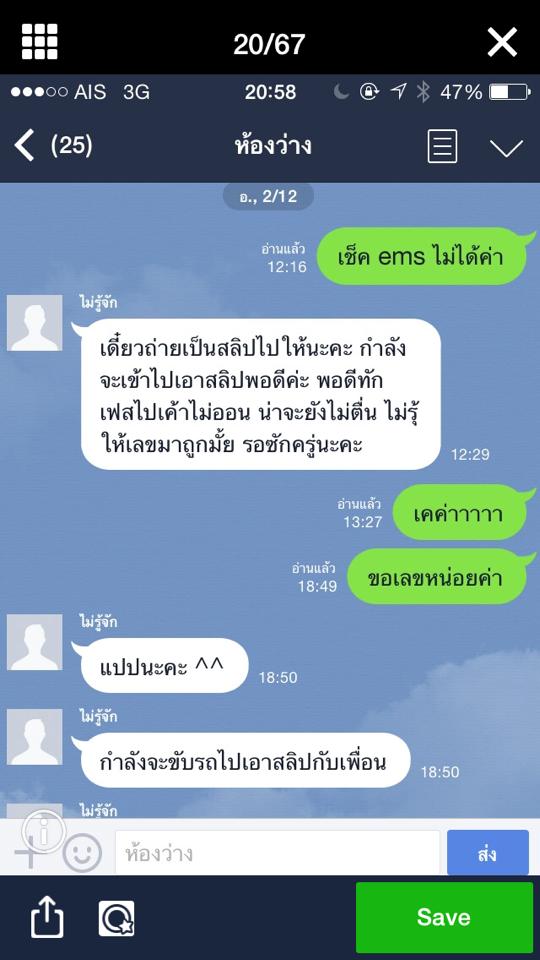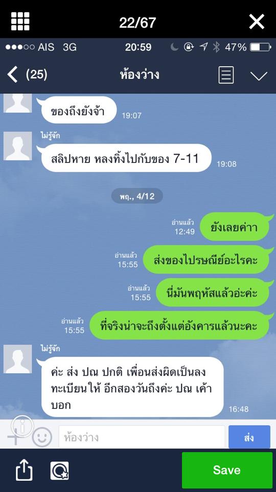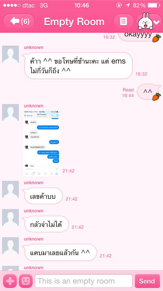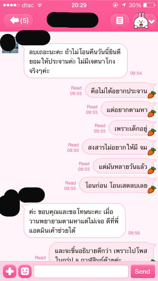 -วันที่ 7 ยังไม่ได้ของถามเค้าว่ายังไง แทรคก็เช็คไม่ได้ ถ่ายรูปจากสลิปมาได้ไหม ไม่มีการถ่ายค่ะ แถๆๆๆ เราเลยบอกว่าเอางี้พี่ขอเงินคืนเพื่อความสบายใจดีกว่าค่ะ แล้วถ้าของมาถึงจริงพี่ยินดีส่งกลับก็ได้ นางก็บอกได้ค่ะเอาพี่สบายใจ เราบอกงั้นโอนเงินคืนได้ไหม เค้าบอกว่าได้ขอบัญชี