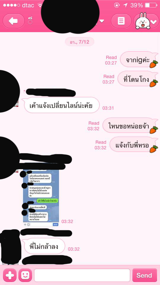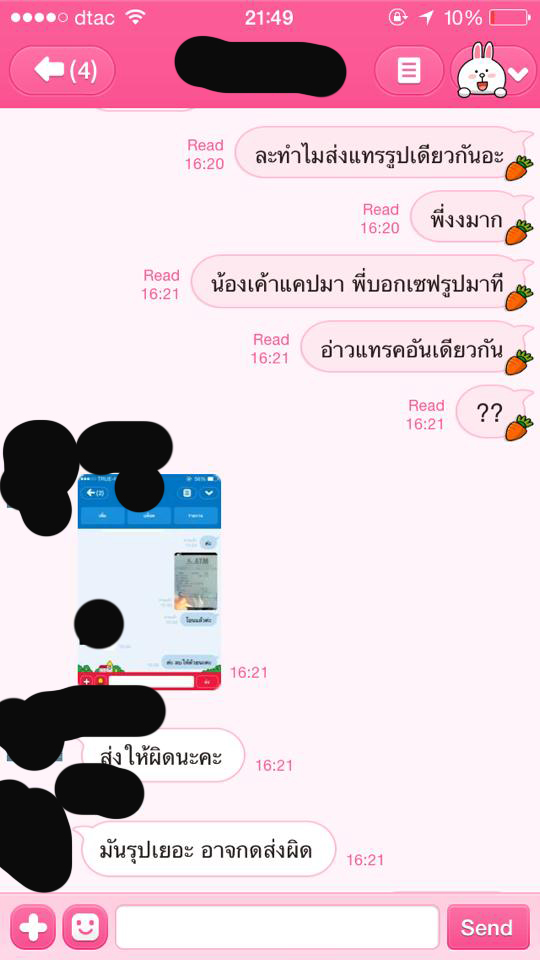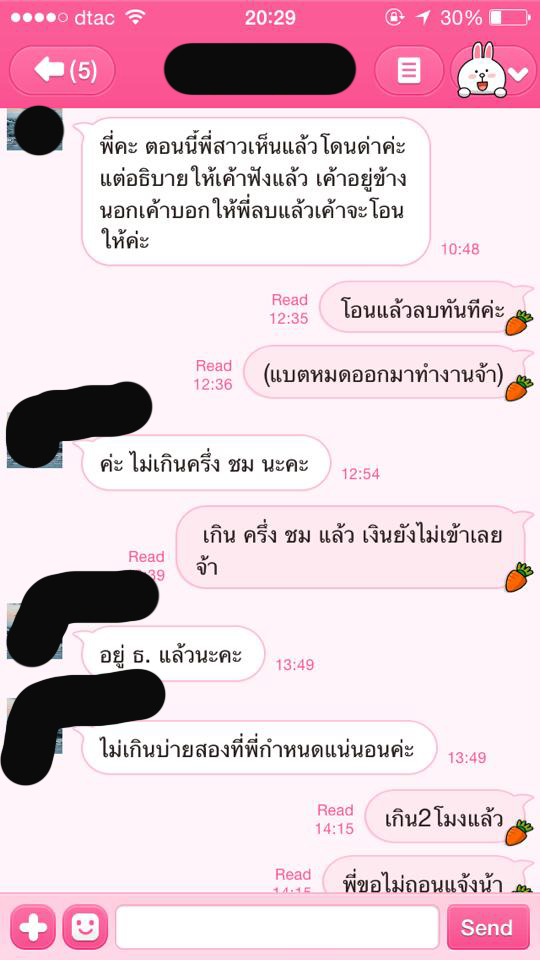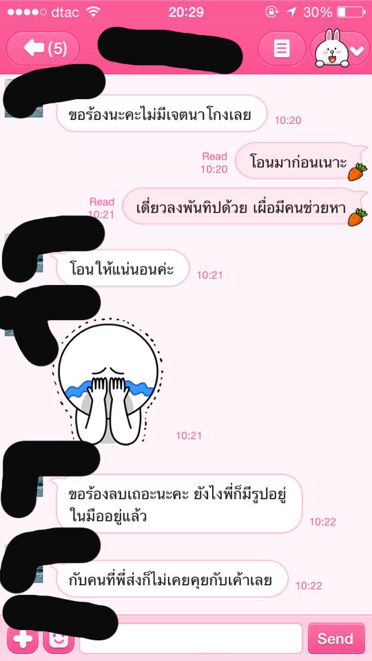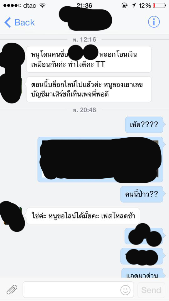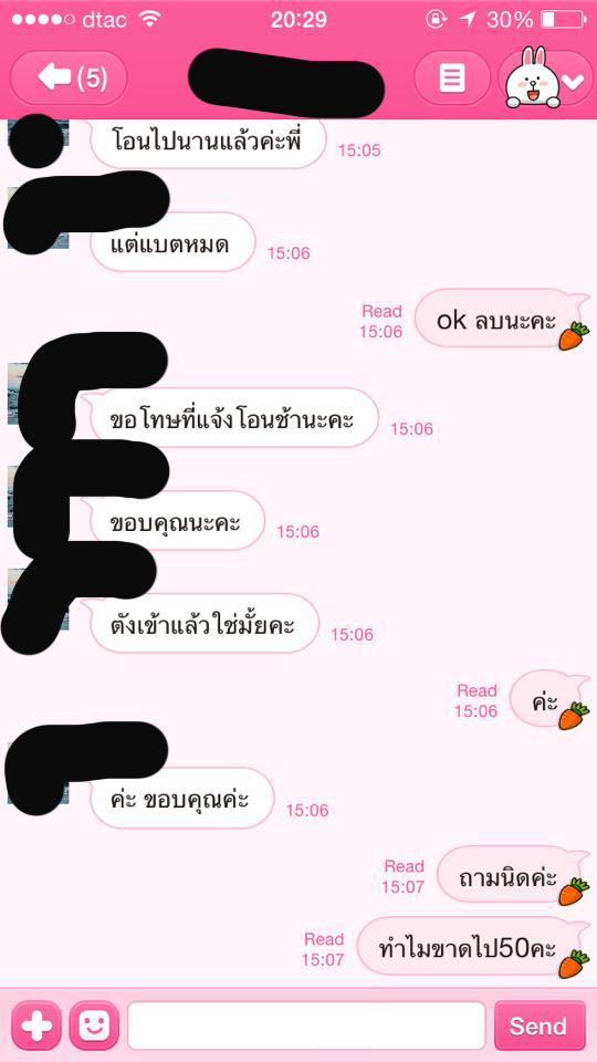 - เลยขอร้านแชร์ไลน์มา น้องเค้าก็เหมือนมาขอโทษค่ะ ขอให้ลบโพสที่บ้านดุมากจะโอนคืนวันนี้ ขอลบตอนนี้จะออกไปโอนแล้ว อีก 30 นาที บลาๆๆๆ คือทำไงก็ได้ลบก่อน แต่เราบอกว่าโอนก่อนแล้วจะลบทันทีเลย ผ่านไป 30 นาทียังไม่ได้ จนให้เวลาถึงบ่าย2 ก็ยังไม่ได้ ได้เกือบบ่าย3 ยอดเงิน 4950 หายไป 50 บาท ถามนางบอกว่าคงโดนหัก เอะ ถ้าหายไป 25 – 30 น่าจะโดนหักจริง แต่ไหงเป็นงี้ น้องเลยบอกว่าเดี๋ยวจ่ายบัตรเติมเงินให้ 50 บาท เราก็เอาเบอร์เพื่อนให้ เราใช้รายเดือนค่ะ จนเพื่อนบอกว่าได้แล้ว รออีก 1 ชมนะกว่าจะได้ 50 บาท แต่งกค่ะ 55555555555555555 จุดนี้เอาทุกบาท ขู่ไปค่ะว่าแจ้งความ จะเอาเรื่อง บลาๆตามที่มโนได้ ตามที่คิดออกตอนนั้นเพราะบอกตรงๆกลัวมาก โดนตุกติกมาตั้งหลายวัน คือถ้าใครโดนอ่ะจะเข้าใจจริงๆนะคะ ไม่คิดจริงๆว่าจะโดน