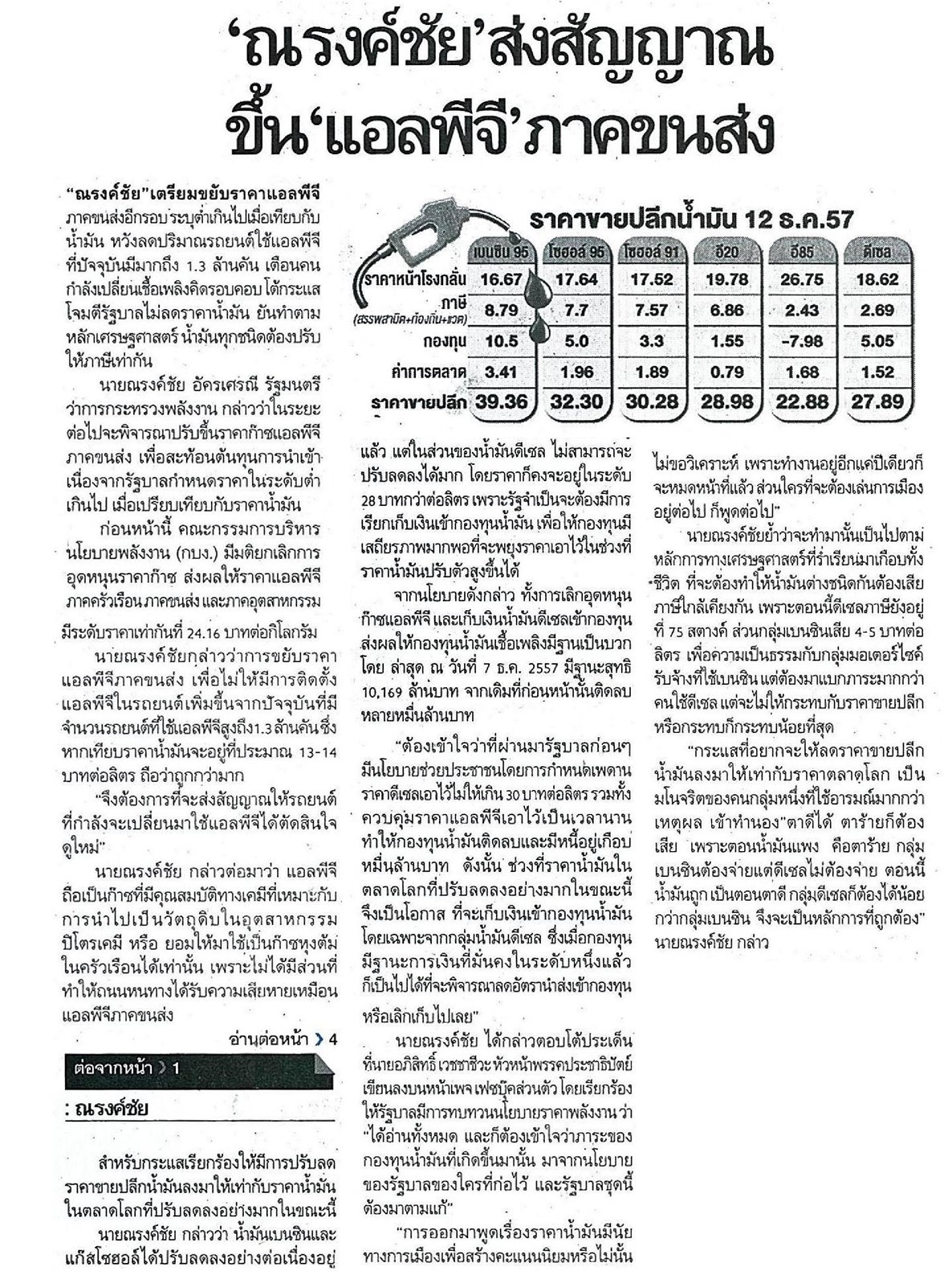 12/12/57 กรุงเทพธุรกิจ "ณรงค์ชัย"ส่งสัญญาณขึ้น"แอลพีจี"ภาคขนส่ง