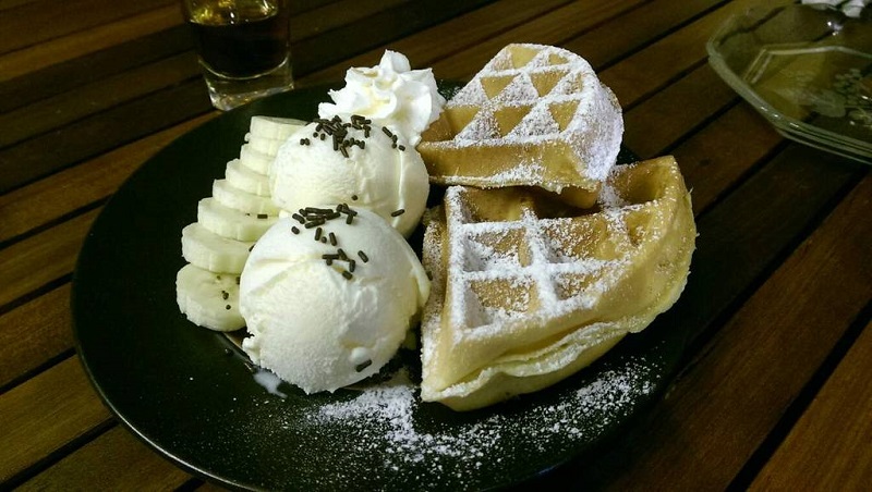 ตามด้วยวาฟเฟิลกรอปนอกนุ่มใน กินกับน้ำเมเปิ้ล อร่อยมากๆ