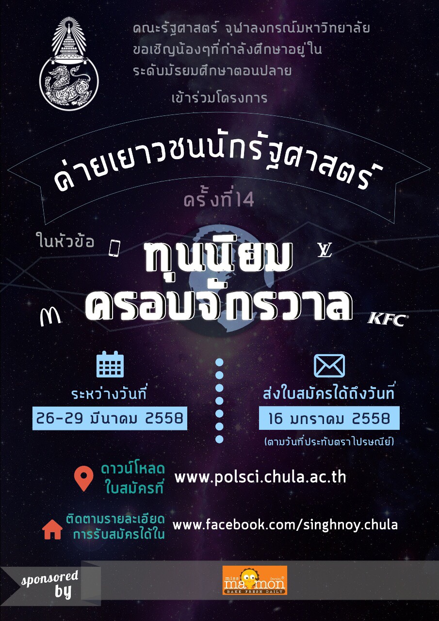 ค่ายเยาวชนนักรัฐศาสตร์ จุฬาลงกรณ์มหาวิทยาลัย กลับมาอีกครั้งหนึ่งนะครับ คราวนี้เปิดโอกาสให้น้องๆชั้นมัธยมศึกษาตอนปลายที่สนใจเป็นส่วนหนึ่งในการเข้าร่วมโครงการค่ายเยาวชนนักรัฐศาสตร์ ครั้งที่ 14 ในหัวข้อ"ทุนนิยมครอบจักรวาล" น้องๆคนไหนสนใจเข้าไปดาวโหลดใบสมัครได้ที่ www.polsci.chula.ac.th หรือติดตามข่าวสารรวมไปถึงรายละเอียดการรับสมัครได้ที่ www.facebook.com/singhnoy.chula ภายในวันที่ 16 มกราคม 2558 นี้นะครับ