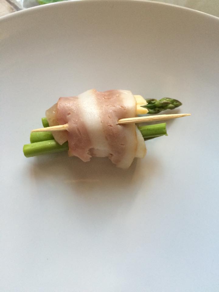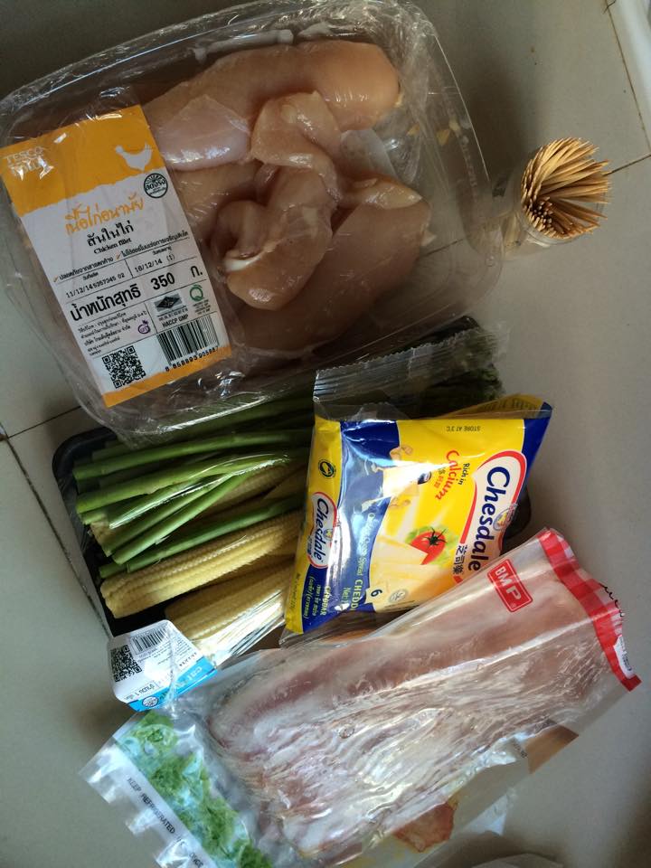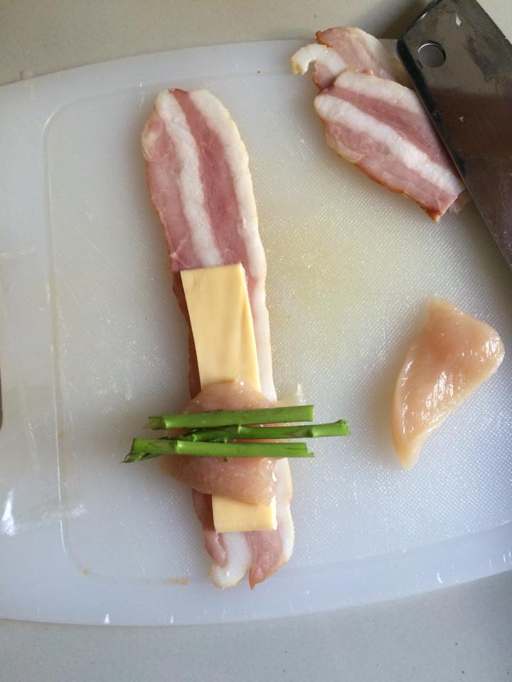 ขั้นตอนต่อไปง่ายๆเลย เอาเบค่อนมาวาง ตามด้วย อกไก่ ชีส หน่อไม้ฝรั่ง หรือจะเปลี่ยนเป็นแครอทก็ได้ค่ะ