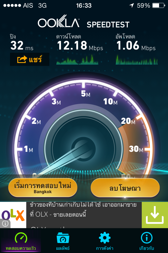 ตอนเทส ตอนแรกขึ้นมาเกือน 1 mbps แล้วก็ลงๆๆ มาจนได้เท่านี้ 3G ก็ยังไม่หมด ซื้อเพิ่มจนค่าโทรศัพท์ตอนนี้ พันกว่าแล้วแต่เล่นได้แค่นี้สัญญาณก็เต็ม