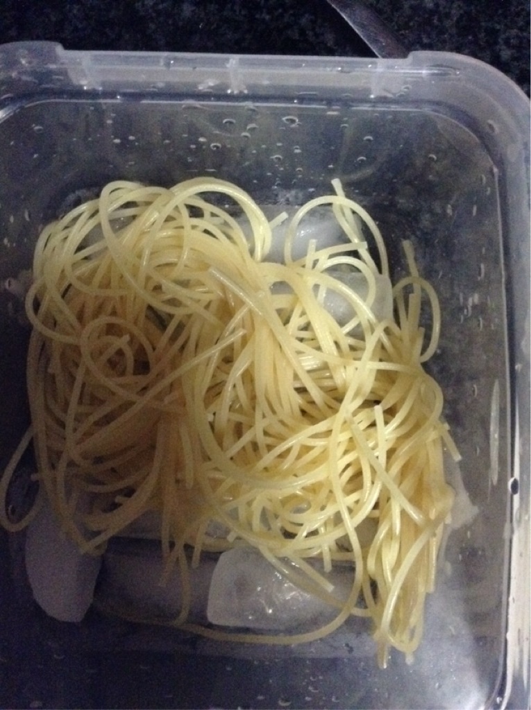 เมื่อครบเวลา ให้นำเส้นมาช็อคหยุดความร้อน ด้วยการใช้ตะแกรงตักเส้นขึ้นจากน้ำเดือด นำมาลวกในน้ำเย็นจัดทันที สะเด็ดน้ำและคลุกด้วยน้ำมันมะกอกเล็กน้อย พักไว้
