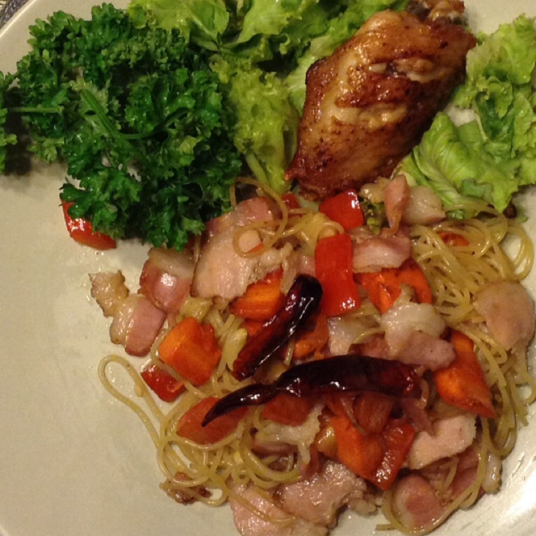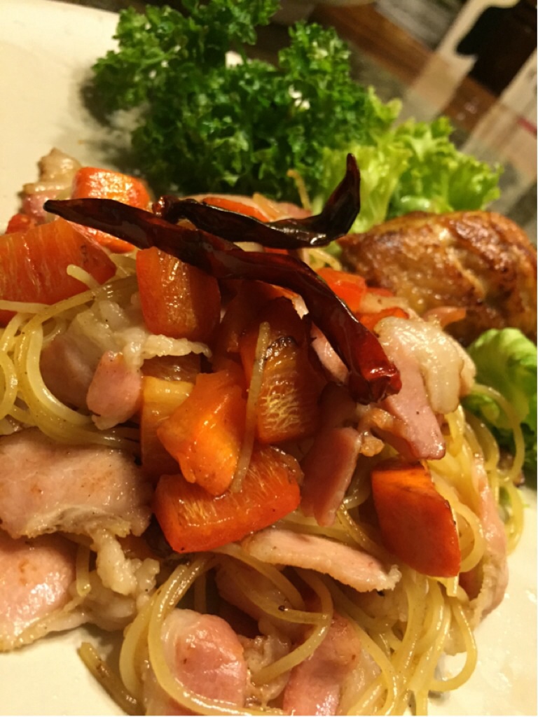 สปาเก็ตตี้ผัดเบคอนพริกแห้ง