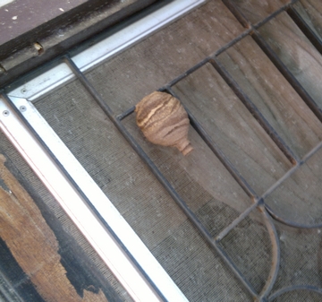 พอดีวันนี้ผมเจอรังแตนเล็กๆ ในโรงรถ ผมเลยจัดการเผารังทิ้งไป แล้วตอนที่ผมเข้าไปดับไฟ ฉีดไบก้อน ผมเห็นรังแบบนี้ น่าจะรังดิน ผมเลยจุดไฟเผาอีกรอบ ราวๆ 2-3 นาที เท่าที่อำนวย เลยมาถามกันนิดนึงคร