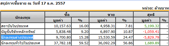Sinthorn Summary 17/12/2557 : ต่างชาติขายสุทธิ -5,829.79 ลบ.