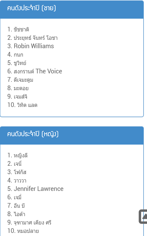 เว็บไซต์ Google เผยเทรนด์การค้นหาของคนไทย ประจำปี 2557 รวบรวมผลจากคำค้นหาที่ชาวเน็ตสืบค้นในอินเทอร์เน็ต ผ่านเว็บไซต์กูเกิล และได้มีการแบ่งหมวดหมู่ดังนี้ คนดังประจำปีฝ่ายชาย อันดับที่ 1 ตกเป็นของ 'ช