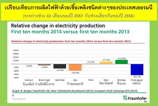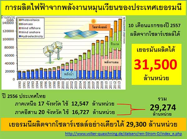กล่าวเฉพาะพลังงานแสงอาทิตย์ทั้งๆ ที่ประเทศเยอรมนีมีความเข้มของแสงแดดต่อพื้นที่หนึ่งตารางเมตรประมาณ 60% ของประเทศไทย แต่สามารถผลิตไฟฟ้าจากแผงโซลาร์เซลล์ในปี 2556 ได้ถึง 29,300 ล้านหน่วย ซึ่งพลังงานไฟฟ้านี้มีมากกว่าที่คนไทยใน 17 จังหวัดภาคเหนือและ 20 จังหวัดภาคอีสานใช้รวมกัน (ดูรายละเอียดพร้อมแหล่งข้อมูลจากแผ่นภาพ)