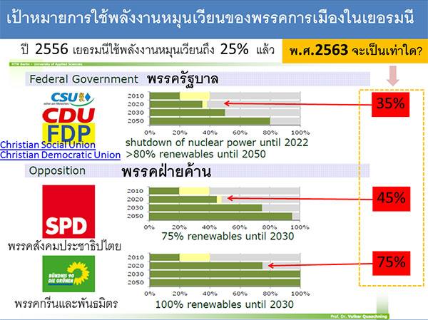 เป็นความจริงอยู่ว่า การผลิตและการส่งกระแสไฟฟ้ามีรายละเอียดที่ซับซ้อนที่จำเป็นต้องคำนึงถึง แต่ในแง่ของปริมาณพบว่า ในปี 2556 ประเทศเยอรมนี สามารถผลิตกระแสไฟฟ้าจากพลังงานหมุนเวียนได้ถึง 147,100 ล้านหน่วย ในขณะที่ประเทศไทยใช้ไฟฟ้าทั้งหมดรวมกัน 164,340 ล้านหน่วย ซึ่งมากกว่าที่ชาวเยอรมันผลิตได้จากพลังงานหมุนเวียนเพียงเล็กน้อยเท่านั้น