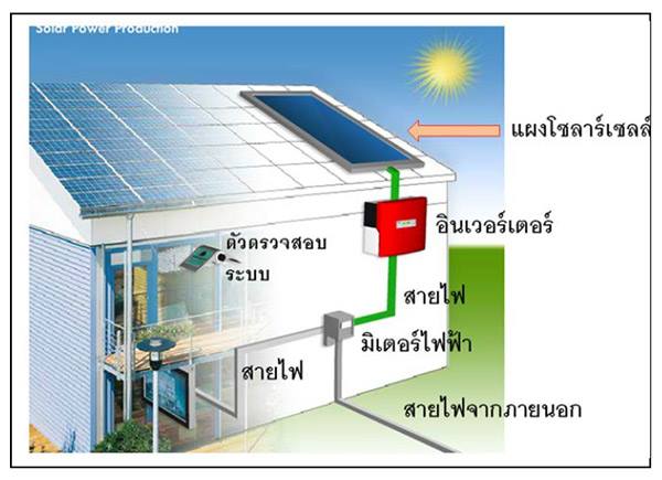 อนึ่ง ระบบแผงโซลาร์เซลล์ไม่ได้ประกอบด้วยแผงที่เราเห็นบนหลังคาเพียงอย่างเดียว แต่ยังประกอบด้วยอุปกรณ์อื่นๆ เช่น ตัวแปลงกระแสไฟฟ้าจากกระแสตรงเป็นกระแสสลับ (Invertor) ตัวตรวจสอบระบบ และอื่นๆ ดังรูป