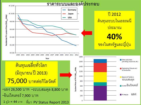 ข้อมูลในแผ่นภาพข้างล่างนี้ แสดงถึงการเปรียบเทียบราคาของระบบโซลาร์เซลล์บนหลังคาบ้านของ 3 ประเทศ คือ เยอรมนี ญี่ปุ่น และสหรัฐอเมริกา (กราฟซ้ายมือ) สิ่งที่น่าสนใจก็คือในประเทศเยอรมนี ซึ่งเป็นประเทศที่ประสบผลสำเร็จมากที่สุดในโลก ราคาระบบโซลาร์เซลล์อยู่ที่ประมาณ 40% ของราคาในสหรัฐอเมริกาเท่านั้น