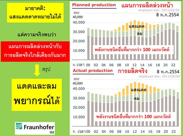 ประเด็นที่ว่า “แสงอาทิตย์คาดหมายล่วงหน้าไม่ได้” ทำให้เกิดความยุ่งยากในการวางแผนการผลิตไฟฟ้า จากการศึกษาของประเทศเยอรมนีพบว่า มายาคติดังกล่าวไม่เป็นความจริง เพราะเมื่อมนุษย์สามารถพยากรณ์อากาศได้ ก็ย่อมสามารถพยากรณ์แสงแดด และลมได้นั่นเอง (ดังกราฟในแผ่นภาพ)