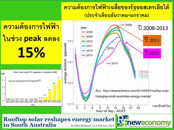 จากการศึกษาของ Australia Energy Market Operator พบว่า ความต้องการไฟฟ้าสูงสุดของรัฐออสเตรเลียใต้ ในช่วงปี 2008 ถึง 2013 ได้ลดลง 15% ในขณะที่ความต้องการไฟฟ้าในเวลากลางคืนของปีหลังสุดสูงกว่าของปี 2008 ซึ่งเป็นผลมาจากการติดโซลาร์เซลล์บนหลังคาบ้านทุก 1 ใน 5 หลัง จำนวน 267 เมกะวัตต์ พลังงานไฟฟ้าที่ผลิตได้จากโซลาร์เซลล์มีสัดส่วนประมาณ 2.4% ในปี 2556