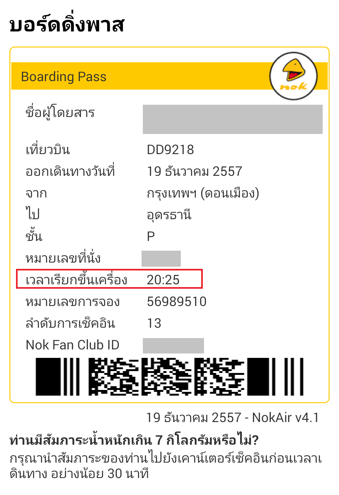 หน้าจอจากแอ๊พ Nokair (เช็คอินหลังได้รับ SMS ตอนประมาณ 8โมง)