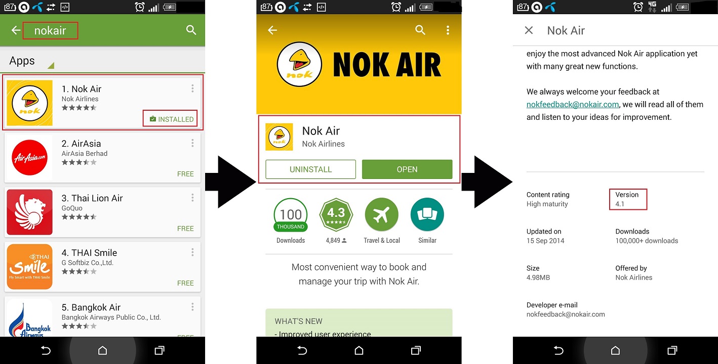 เรื่องที่สาม จากปัญหาในข้อแรก ผมก็ได้รับคำตอบจาก 1318 ว่าให้ใช้ app เวอร์ชั่นล่าสุด น่าจะเป็นที่ผมใช้ app เก่า ผมพยายามชี้แจงยังไง ก็สรุปว่าเป็นที่ผม appผม ทาง Nokair แจ้งว่าต้องใช้ app Nokair ที่เป็นสีฟ้า เวอร์ชั่น 4.1 ผมหายังไงก็ไม่เจอ ชี้แจงยังไง Nokair ก็ไม่ฟัง บอกให้ผมไปหาโหลดเวอร์ชั่นสีฟ้า ไม่ทราบว่าผมต้องไปหาที่ไหนครับ