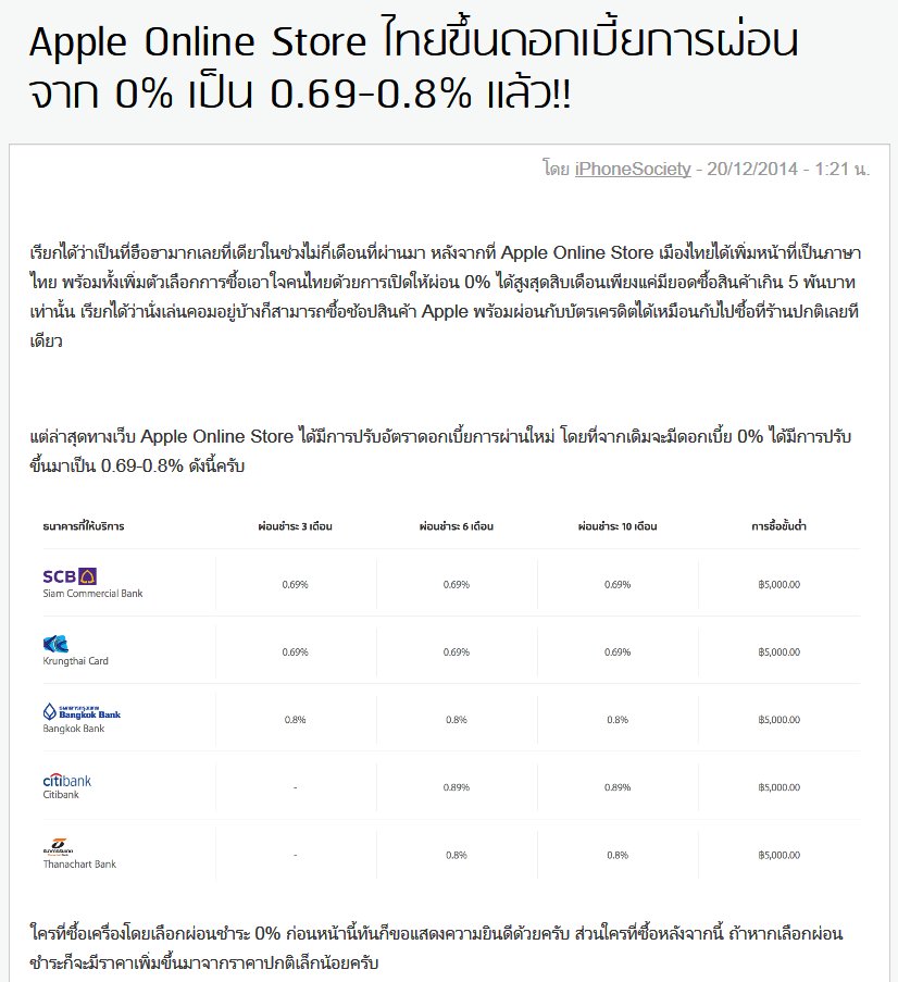 Apple Online Store ไทยขึ้นดอกเบี้ยการผ่อน จาก 0% เป็น 0.69-0.8% แล้ว!!
