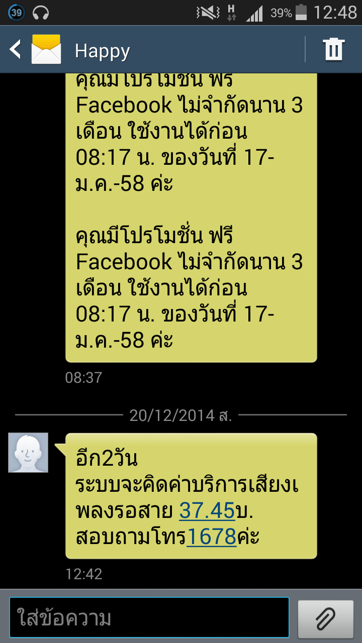 ยกเลิกบริการเสียงรอสายไปแล้ว ยังจะมีข้อความมาบอกว่าอีกสองวันจะเก็บค่าบริการ ไม่เคยสมัครเลยด้วยซ้ำไป แต่เคยยกเลิกไปแล้วรอบ ยังจะมีข้อความมาอีก