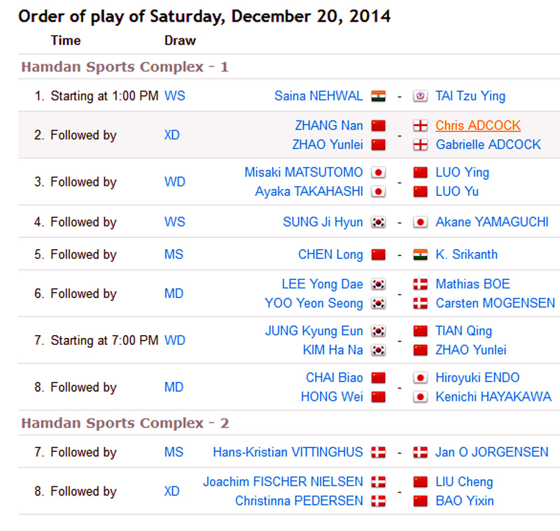 โปรแกรมการแข่งขัน แบตมินตัน BWF World Superseries Finals 2014 : รอบรองชนะเลิศ 20 ธ.ค. 2557 (คู่แรกแข่งเวลา 16.00 น.)