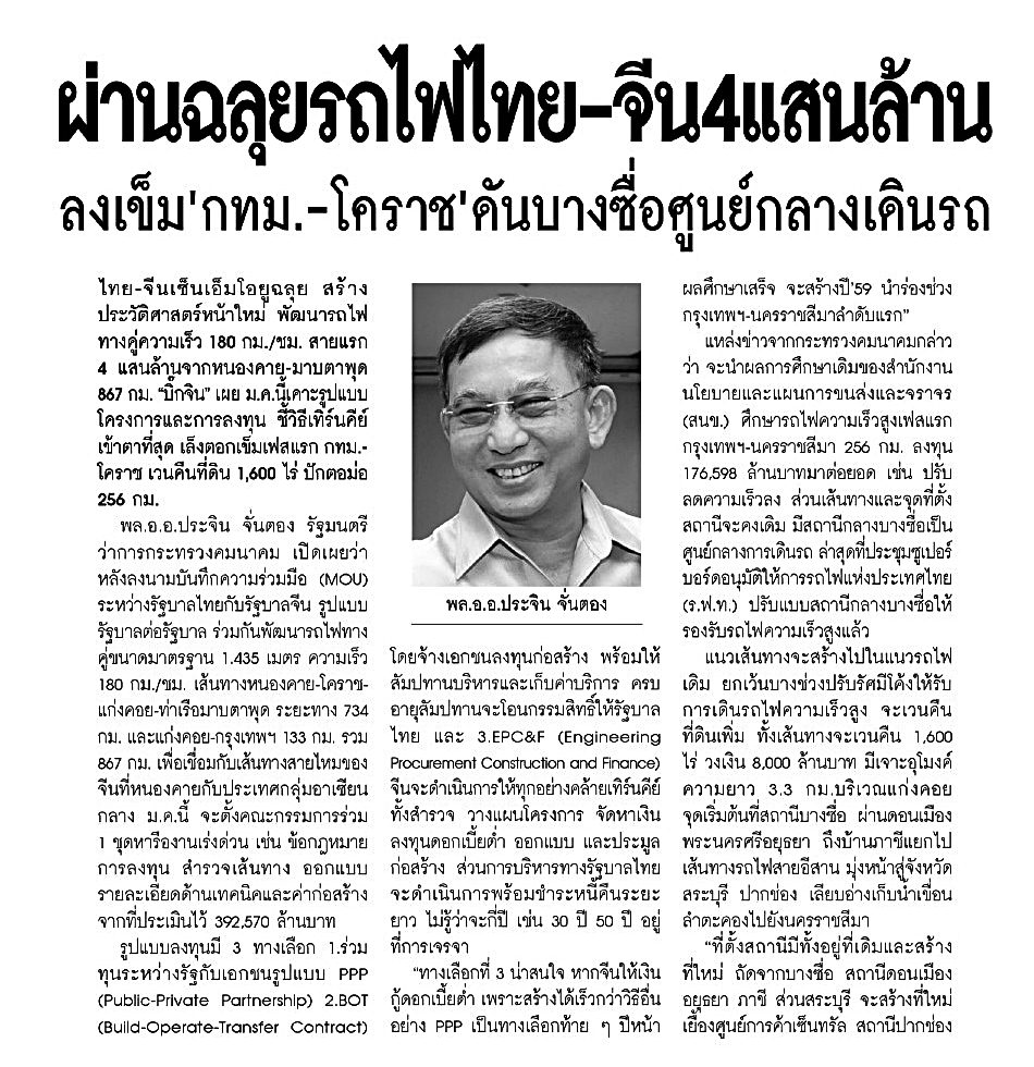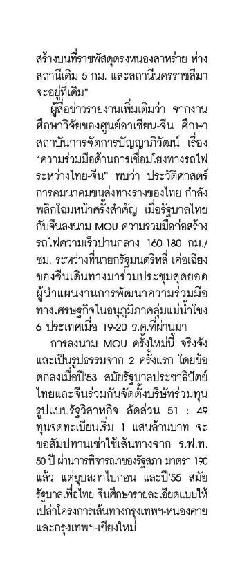 รถไฟฯฮึด ลุยล้างหนี้เอง! ชงพื้นที่บางซื่อ เข้ากองทุนฯ/แปลงอื่นเอกชนร่วม ฐานเศรษฐกิจ ฉบับวันที่ 14 ธันวาคม พ.ศ. 2557 15/12/57 ประชาชาติธุรกิจ คอลัมน์ ข่าวสั้น: รัฐบาลไทย-จีน MOU สร้างทางรถไฟ