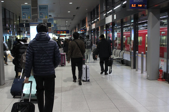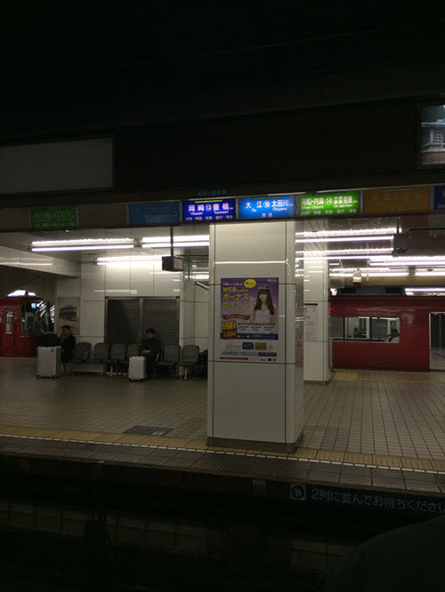 รถไฟเอกชนสาย Meitetsu ของที่นี่เวลาไปยืนรอให้สังเกตุสีที่พื้นด้วยนะครับ ให้ตรวจสอบว่าสถานที่ปลายทางเราอยู่สีไหนแล้วก็ไปยืนรอที่สีนั้นครับ เดี๊ยวตอนรถไฟมาจอด ประตูเข้าจะตรงกับสีนั้นๆพอดี