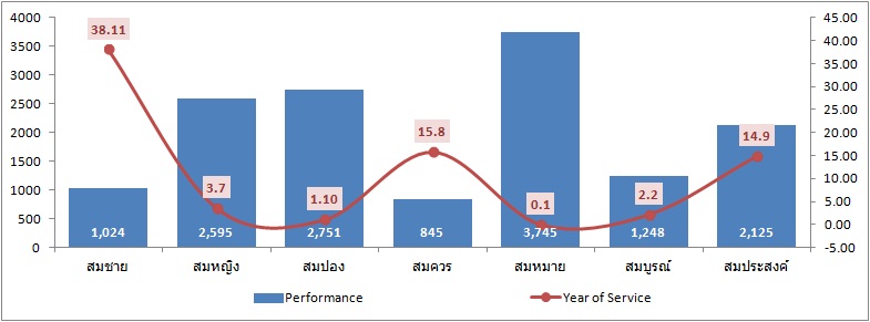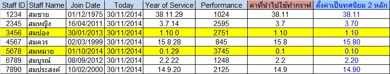 ซึ่งผมเจอปัญหาว่าจะให้แสดงกราฟเส้น Year of Service จะต้องแปลงค่าเป็น number และให้เป็นทศนิยม ซึ่งจะเจอปัญหาของคนที่มี Year of Service ที่ 1 เดือนของสมหมายกับ 10 เดือนของสมปอง เพราะถ้ากำหนดค่าทศนิยม 2 หลักจะได้ค่าของคนทั้งคู่และคนอื่น ๆ ไม่ถูกต้อง ตามรูปนี้ครับ